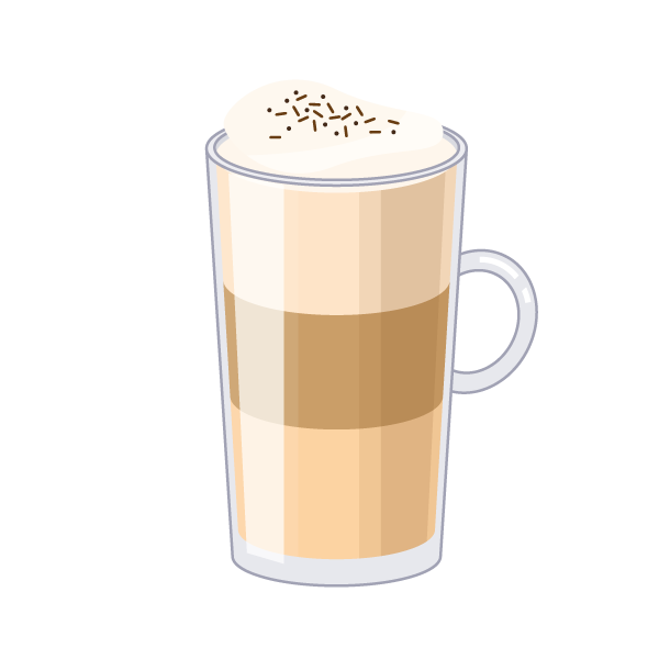 Een Latte Macchiato bestaat uit zichtbare laagjes van melk, koffie en melkschuim.